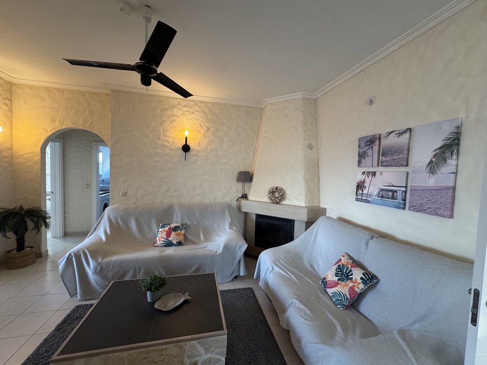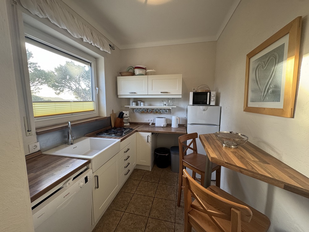 con entrada separada. Mientras, el terreno y la piscina son de uso exclusivo de los huéspedes. Con una cocina muy bien equipada, 3 dormitorios, 2 baños con ducha, salón con tv francés/alemán, comedor con acceso directo a la terraza. Con aire acondionaco/bomba de calor. Posibilidad de aparcar los coches sobre el mismo terreno. Hay una cala, con piedras, a unos 300 m que suele ser visitada por los amantes del buceo. La playa de arena fina más cercana es la de Cala Montgó, a unos 750 m.